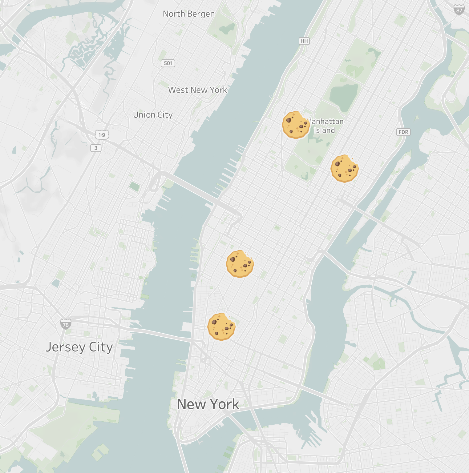 Zooming into the New York metro, there are only 4 locations in Manhattan (and none across the river in Brooklyn, Hoboken, or Jersey City).