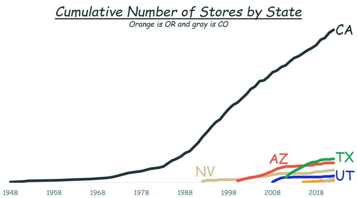 Recent growth outside of California has been driven by adding locations in Texas starting about a decade back while also incrementally adding across Arizona and Nevada, and most recently focusing on Colorado.