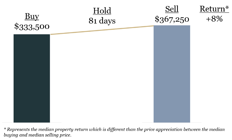 Home sales to investors sold almost 30 days faster than those to individuals (likely a result of a cash sale instead of a financed sale), had a higher return on investment (~10% median property price appreciation vs. ~7.5% for households), and were much less likely to sell at a loss (~1.5% of sales compared to 9% for households).