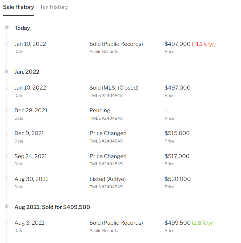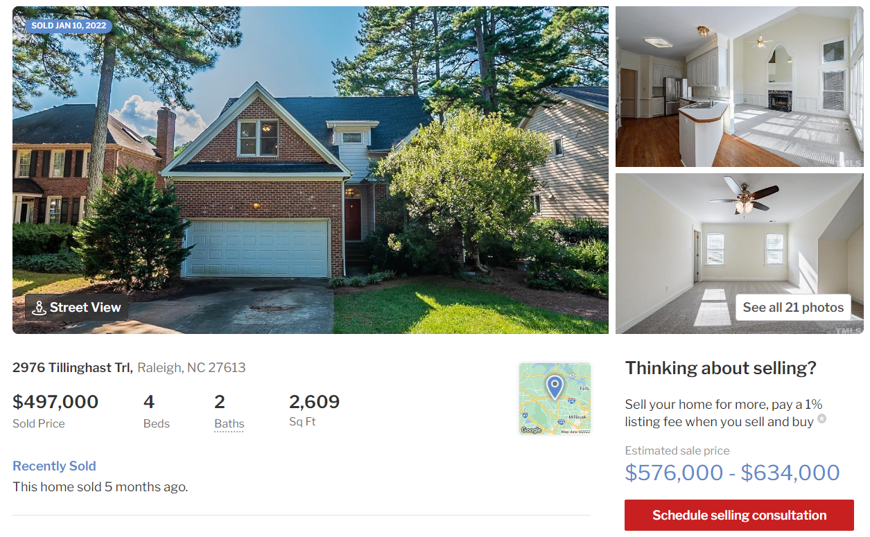 Example screenshots from Redfin for an Opendoor-purchased home that lost money