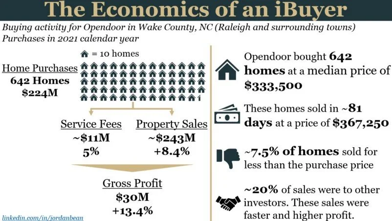 Public records indicates that Opendoor made more than 640 purchases in Wake County in the 2021 calendar year. Their typical home was bought for $333,500 and sold for $367,250 over an 81 day holding period. Their total capital investment (property purchases) was ~$224M and these properties sold for ~$243M, generating an ~8.4% return.