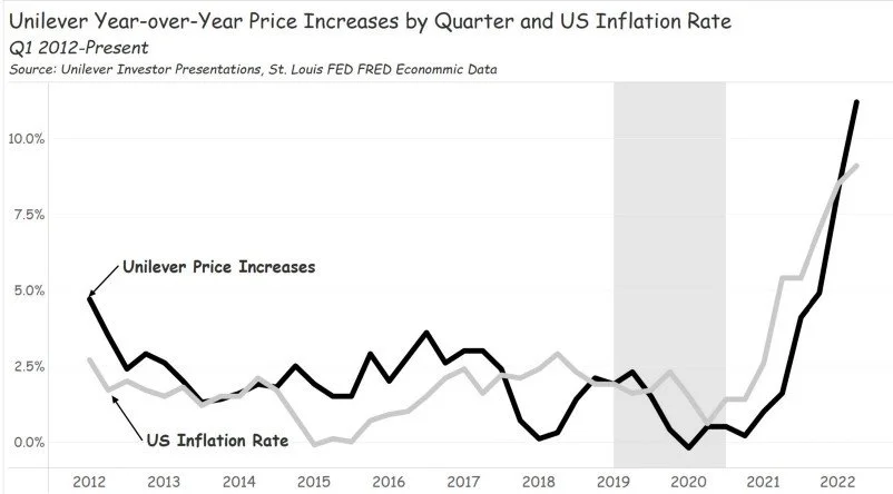 Bringing together these two pieces of information, the data suggests that Unilever price increases have historically pre-empted or stayed above inflation, at least up until the last year or two. For example, look at the area shaded in gray in the graph below. Unilever prices (black line) peaked then dropped, and 2 quarters later inflation (light gray line) showed a similar trend. Then Unilever prices rose, and so did inflation. In the last two years, Unilever has been playing catch up as inflation has risen at historically fast rates.