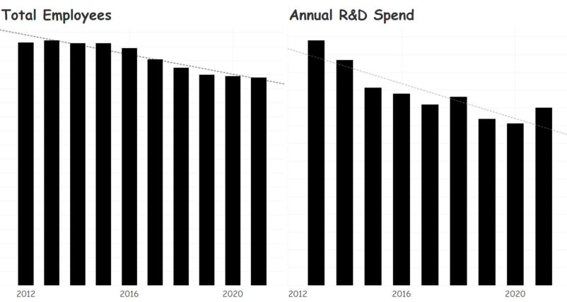 Headcount was down nearly 25,000 employees from as recently as 2015 (a ~15% reduction) and annual R&D spend is down ~€400M compared to 2012.