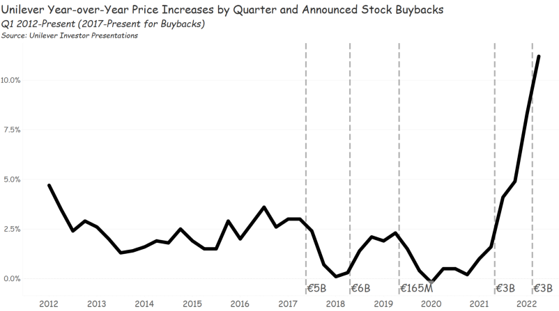 As a diversified Consumer Packaged Goods (CPG) company, Unilever’s pricing represents a diverse set of products that in many ways is representative of the goods that Americans buy on a weekly basis, and therefore is likely to move at a rate generally around inflation. We can use this assumption to pair up Unilever’s price increases with US inflation data.