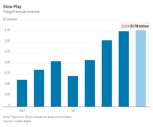 At the same time, Topgolf’s revenue stalled. Year-over-year same venue sales declined in the second quarter of this year and total revenue is expected to be about flat in 2024.